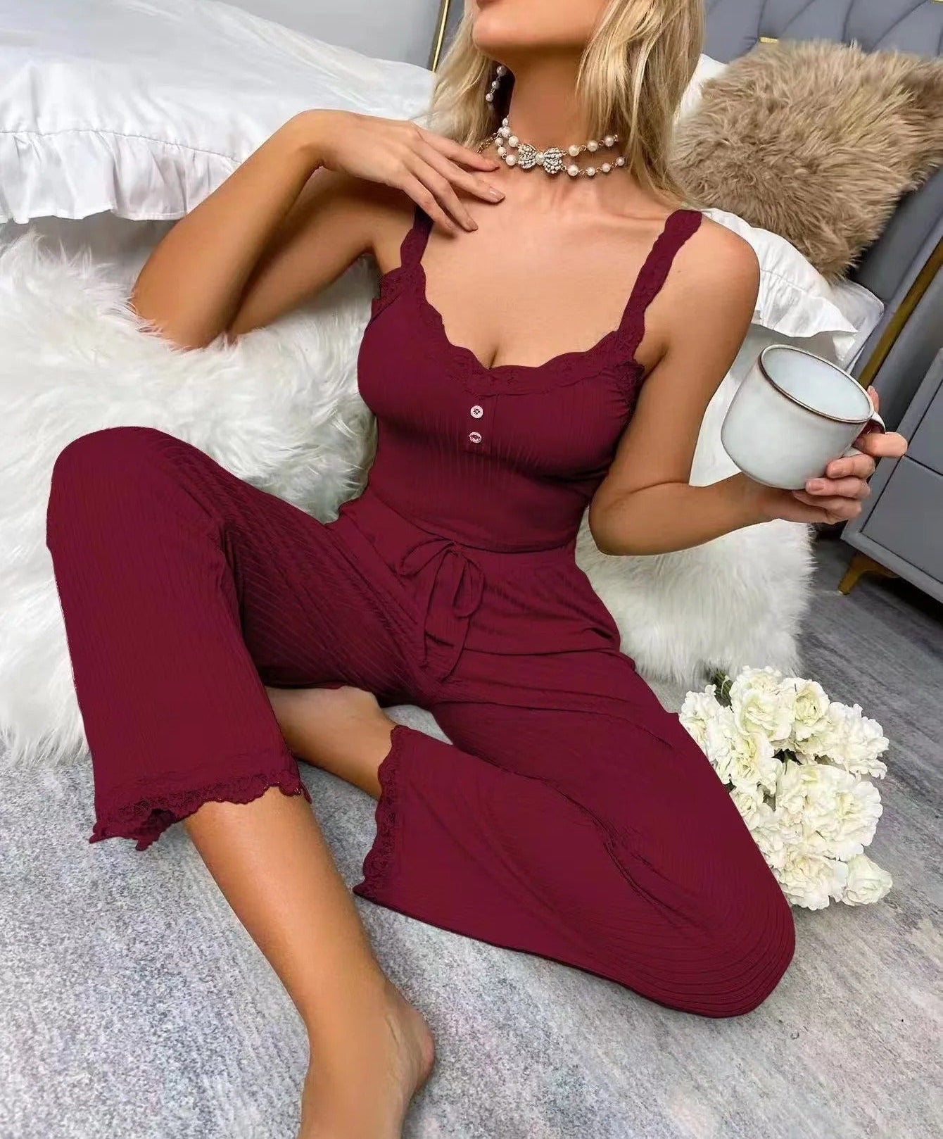 Slip into the Erin two-piece pajama set and feel effortlessly sexy and comfortable. This playful set features a slim-fit suspender top with delicate lace edging and matching pants, made from soft, cozy fabric that moves with you. Perfect for relaxing evenings or those special nights in, Erin blends charm and comfort in one stylish package.